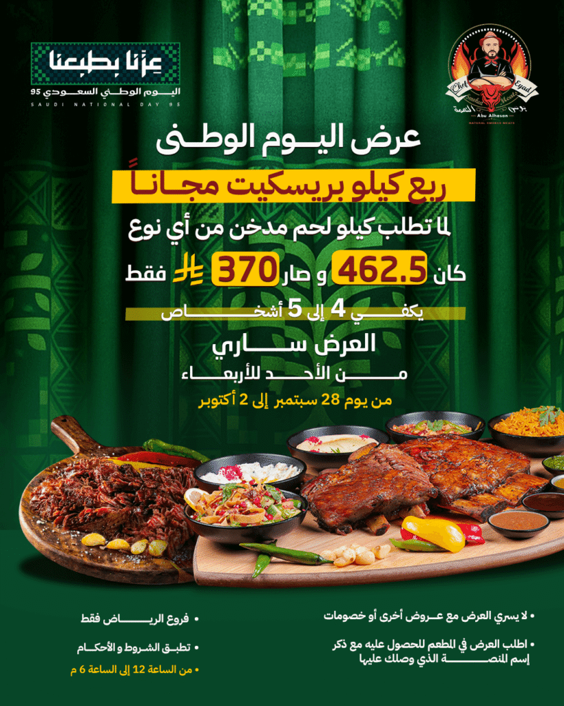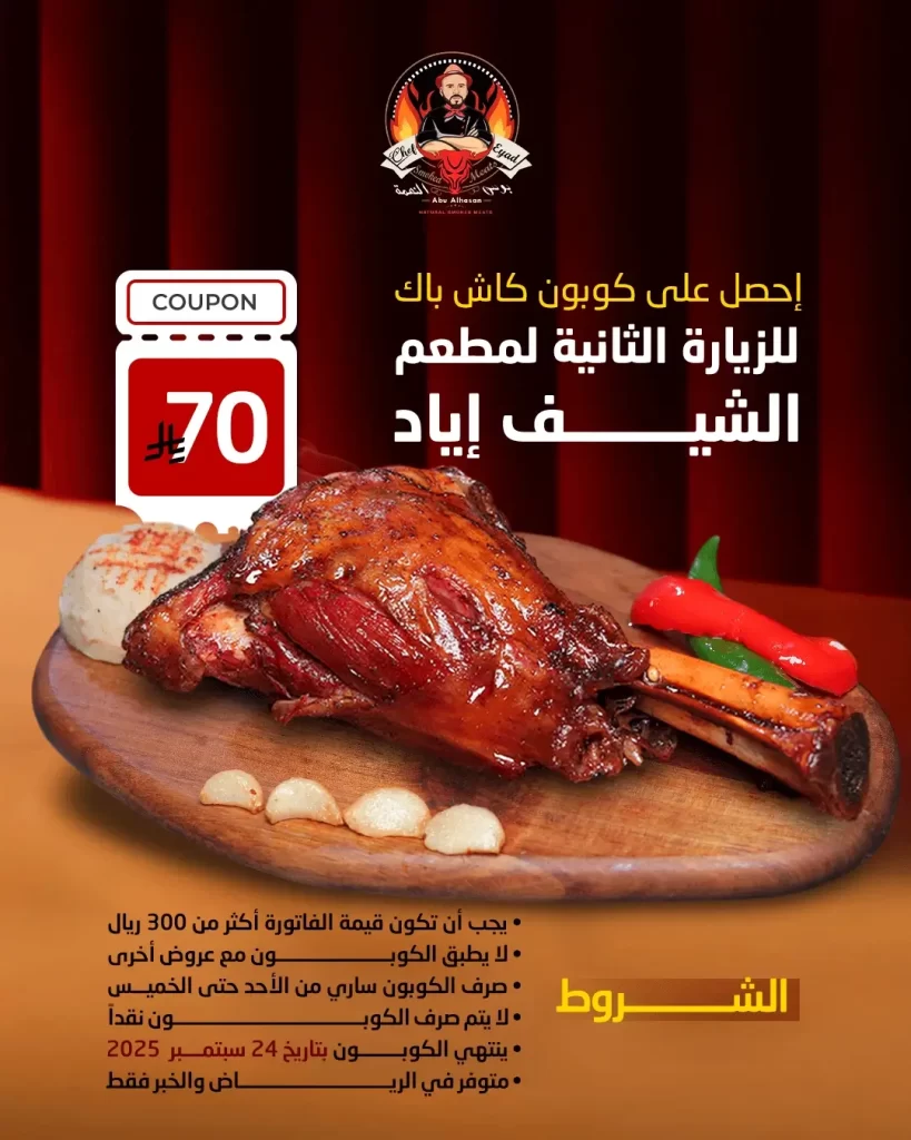 احصل على قسيمة خصم بقيمة 70 ريال لاستخدامها في زيارتك القادمة لمطعم الشيف إياد!