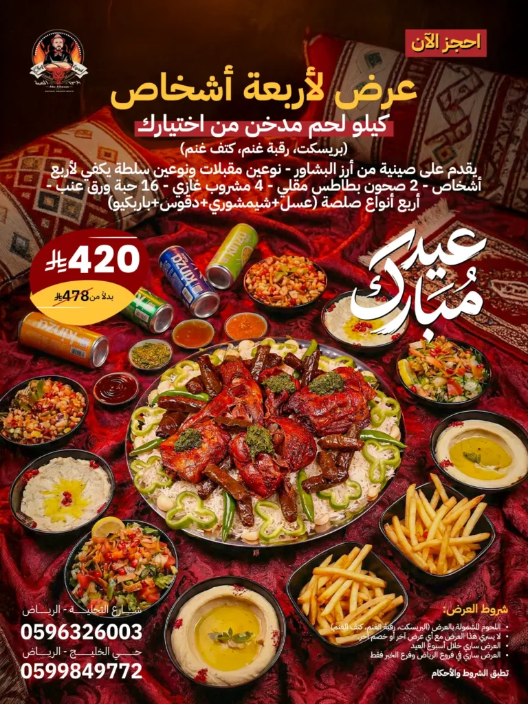 🥣 الشوربة: شوربة عدس أو شوربة اليوم 🍖 الطبق الرئيسي الأول — اللحوم المدخنة حتي الإشباااع (اختيار مفتوح): لحم الغنم – بريسكيت (بلاك أنجوس) 🍗🍚 الطبق الرئيسي الثاني: كبة لبنية تقدم مع أرز بالشعيرية 🍞🥙 الأطباق الجانبية: أرز كبسة – صوص شيميشوري – عسل – صوص باربيكيو – صوص الدقوس – (فلفل رومي و ثوم ) مدخن 🍰 الحلويات: اختيار الشيف اليومي 🥤 المشروبات: مياه معدنية – فيمتو – عصير برتقال ☕🌴 الضيافة: قهوة عربية – تمر – لقيمات – شاي مدخن